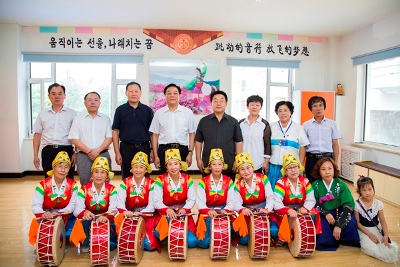 张鸣起副会长在延吉市北山街道丹英社区与居民合影