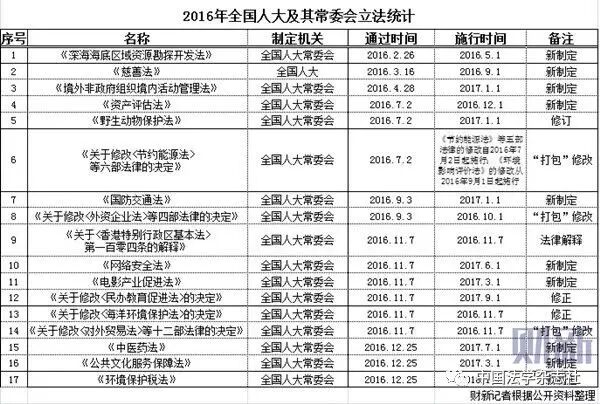 财新记者统计,从年初的《深海海底区域资源勘探开发法》到年底的《环境保护税法》,2016年国家最高立法机关新制定法律10部,修改法律25部,出台法律解释一部(详见表格),还对多部法律草案进行了审议,涉及政治、经济、环保、民生、文化、国防等领域。