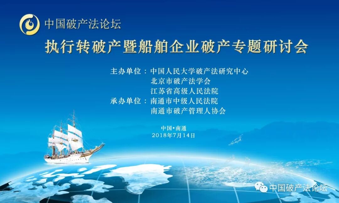 2018年7月14日,“中国破产法论坛﹒执行转破产暨船舶企业破产专题研讨会”在江苏南通成功举办,本次会议由中国人民大学破产法研究中心、北京市破产法学会、江苏省高级人民法院共同主办,南通市中级人民法院、南通市破产管理人协会承办。中共江苏省南通市委常委、政法委员会书记姜永华,江苏省高级人民法院党组书记、院长夏道虎,中国人民大学破产法研究中心主任、教授、北京市破产法学会会长王欣新等领导应邀出席会议并在开幕式致辞,最高人民法院咨询委员会副主任、中国法官协会副会长杜万华应邀出席开幕式并发表主旨演讲。中国人民大学破产法研究中心副主任兼秘书长、北京市破产法学会副会长兼秘书长徐阳光教授主持开幕式。